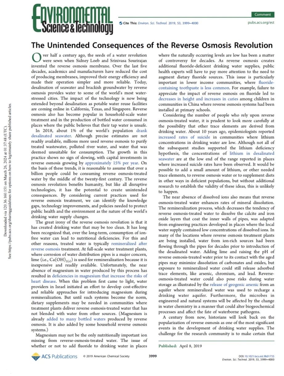記:您認為中國有關(guān)部門是否意識到反滲透膜凈水的意外后果?